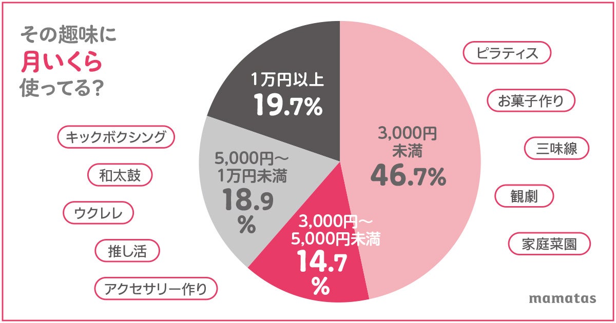 趣味にかけるお金は、5,000〜1万円が18.9%、1万円以上が19.7%と約4割の令和ママが月5,000円以上、自分の趣味にお金をかけています。