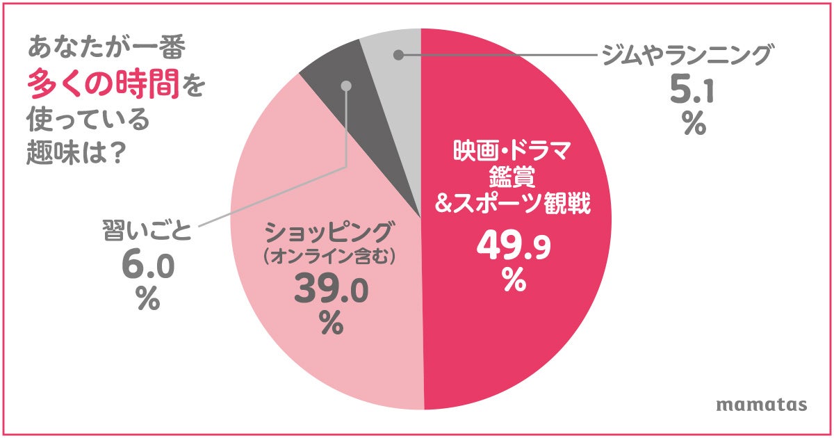 一番多くの時間を費やしている趣味は、「映画やドラマ鑑賞、スポーツ観戦」(49.9%)。サブスクが定着したことで、子どもが寝た後や空き時間を活用して楽しむママが多いようです。「ショッピング」を趣味として楽しむママも39.0%。オンラインを活用するなどして、自分の欲しいものをしっかり購入しています。