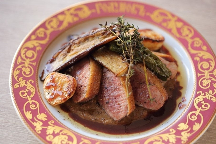 窓から東京駅を臨む眺めの良い店内。大ぶりの鴨肉は、柔らかくも弾力があり、旨みがずっと続きます。ロシアの主食・黒パンにシェリービネガー等を合わせたソースに、今回特別に丸の内をイメージして赤ワインソースをプラス。色鮮やかに仕上げた、まさに渾身の一皿です。