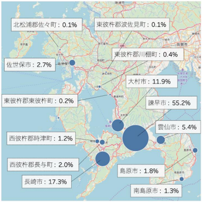 より詳細な人流・動向を把握するため、一例として清水エスパルス戦における長崎県内の各市からの観戦(観光)客の割合を地図上に可視化しました。(図4)