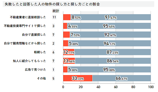 失敗する割合では、「その他」を除くと、「知人に紹介してもらった」13.46%、「相続した」12.77%となりました。