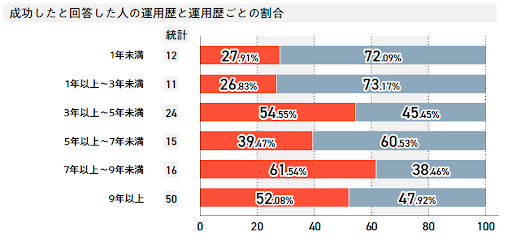 運用歴による成功率の違いでは、「7年以上9年未満」が61.54%、「3年以上~5年未満」が54.55%、「9年以上」が52.08%となります。成功率順と一致はしませんでしたが回答数トップ3と合致する結果となりました。