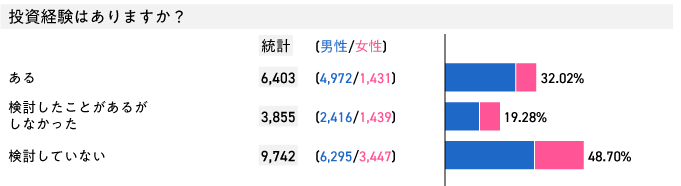 投資経験が「ある」と答えた人は32.02%、全体で6,403人でした。一方、検討していない人は9,742人で48.70%となります。