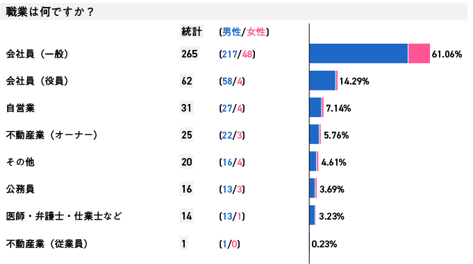 その結果、REITを除いた実物不動産投資に投資をしたのは20,000人中434人でした。そのうちの実に約6割(265人)を、サラリーマン(一般)が占めていたことが判明しました。役員クラスのサラリーマンを加えると約75%です。