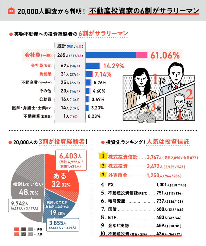 国土交通省のデータを受け、最新のサラリーマンの不動産投資状況を検証するために、まず20,000人に対して調査を行いました。
