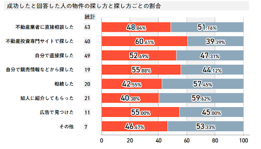 回答数は3位ながら、成功率が60.61%と最高の成績を収めたのは「不動産投資専門サイトで探した」人たちです。