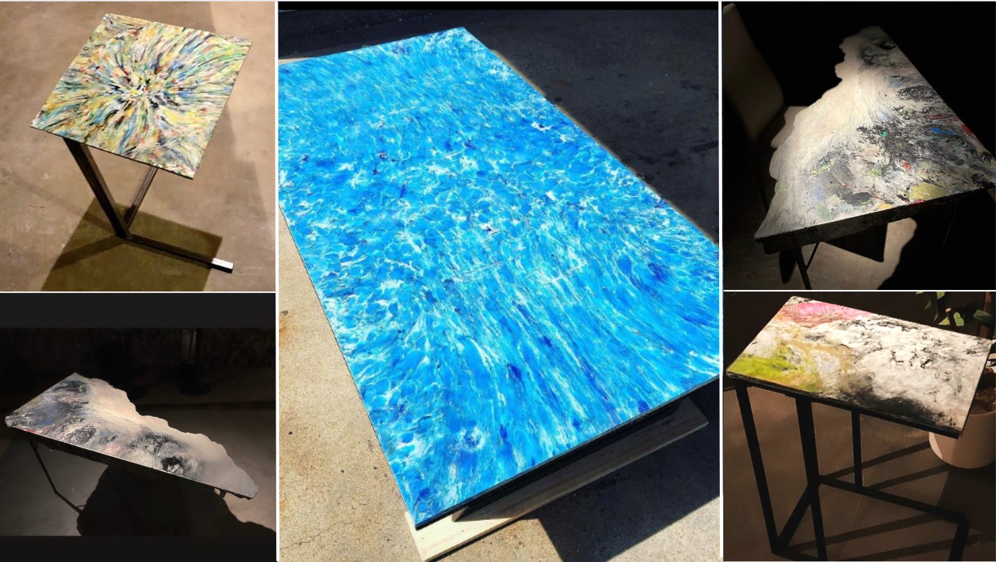 アート性・デザイン性に優れたこの板材は、色の配合によってある程度自由な表情作りが可能なほか、目を引くデザインも空間に馴染むデザインも可能な使用となっているため、空間デザインやオリジナル家具の一部として、重用されています。