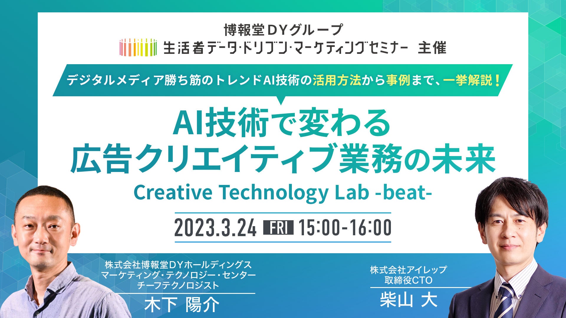 本セミナーでは、博報堂DYグループ横断型の研究開発組織「Creative technology lab beat」のメンバーより、 AI技術をいかにしてデジタル広告へ活用できるのか、そして事例紹介を通じて、AI活用がどのような課題を解決できるのか、AI活用でどれほどの効果が出るのか等を解説いたします。