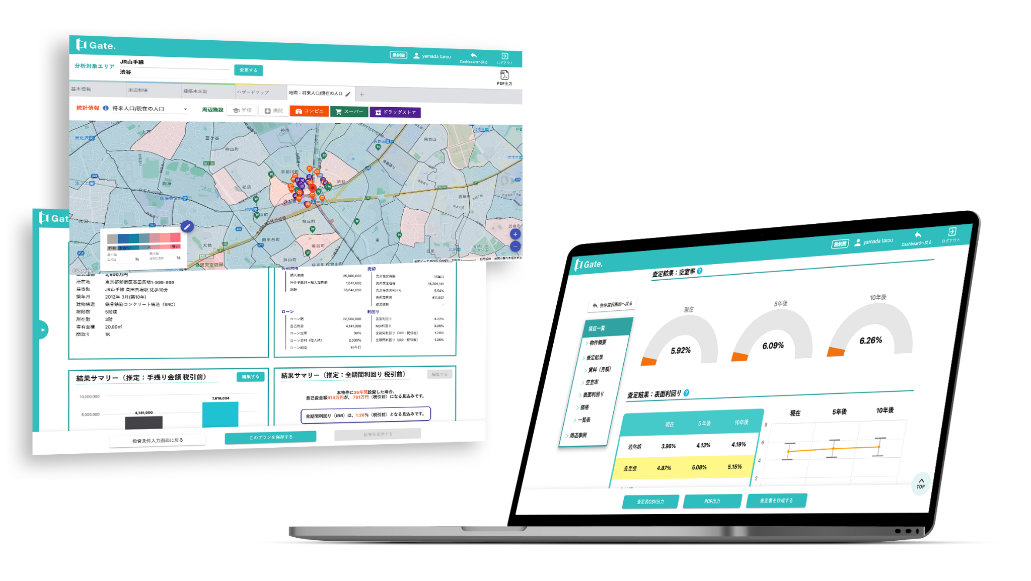 不動産価値分析AIクラウドサービス「Gate.」は15年間独自に収集した2億3,000万件を超える物件データ(2022年11月時点)を元に、人工知能を活用した不動産の査定・投資分析シミュレーションや市場分析・ハザード情報の提供を行っています。