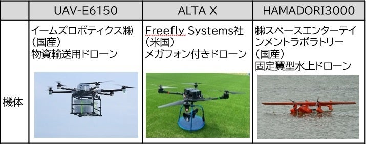 実験には3機の大型産業用ドローンを使用し、「UAV-E6150」は災害時の救援物資、「ALTA X」はメガフォンを搭載し災害時の注意喚起や避難誘導を想定、「HAMADORI3000」は水上をタキシングし、地上と空で同時に運航した場合の実験も行った。