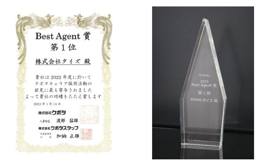 この度タイズは、採用を支援しているクボタ社にて転職エージェントにおける中途入社人数シェアNo.1を獲得し、その採用実績と質とを称えられ、厳選された対象の転職エージェント約40社の中から2022年度ベストエージェント賞第1位を受賞いたしました。