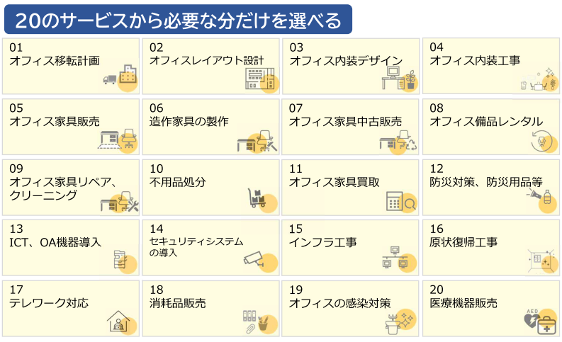 オフィス移転、レイアウト変更には、多くの作業が必要となります。しかし、十分な体制確保が容易でない中小企業、一人で何役もこなさなければならないスタートアップ企業などは、頭の痛いことではないでしょうか。そこで当社は、お客様のご要望に合わせて20の作業にサービスを細分化しご提供いたします。特に以下のようなお悩みを抱えているお客様には最適なサービスをご提供できます。