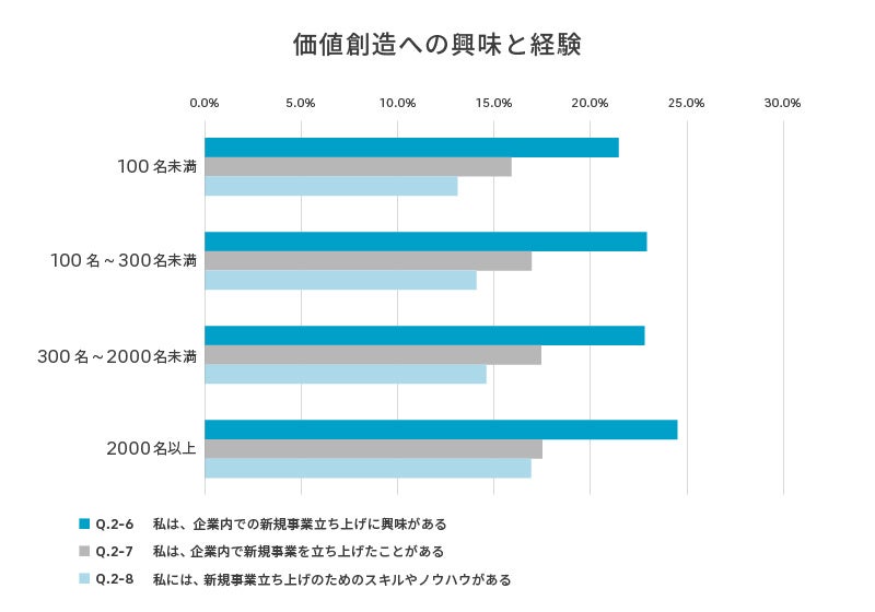 ・「新規事業立ち上げに興味がある」に肯定的な回答をした人は一定いるものの、「新規事業立ち上げのためのスキルやノウハウがある」に肯定的な回答をした人は少ない