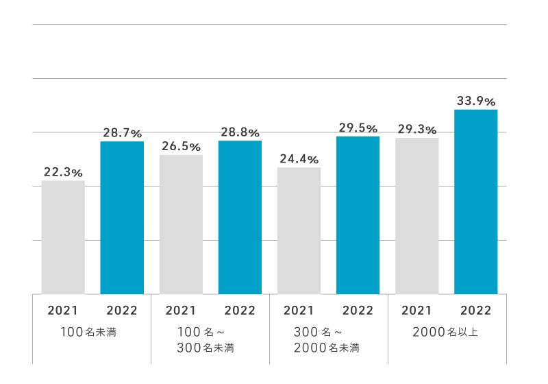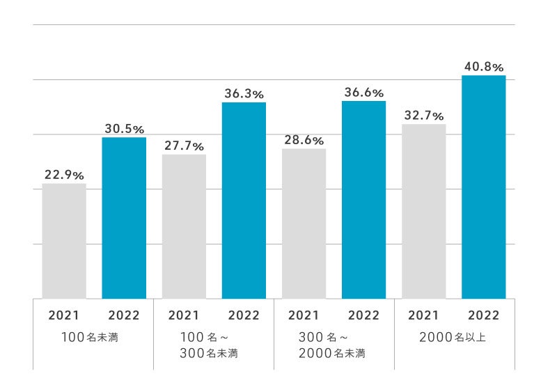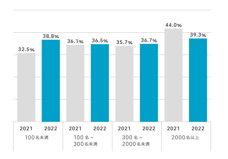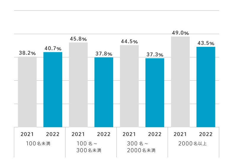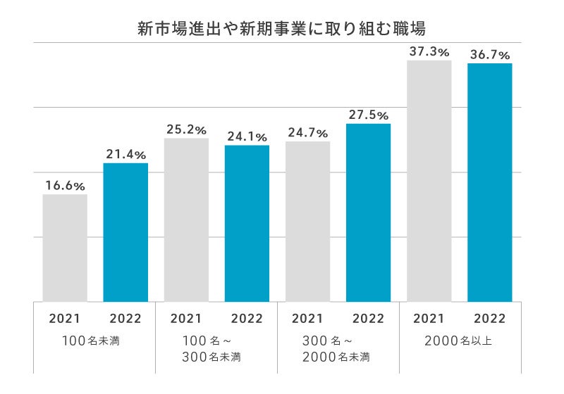 その一方で、新しい市場への挑戦や新規事業の創出に取り組む企業は微減しています。市場開拓や新規事業の創出は、ポストコロナ時代の生存戦略のひとつです。それを実現させるため、仕事への満足度を高めていく施策や、従業員同士が意見を交わす文化づくり、環境づくりがより一層重要になっていくでしょう。