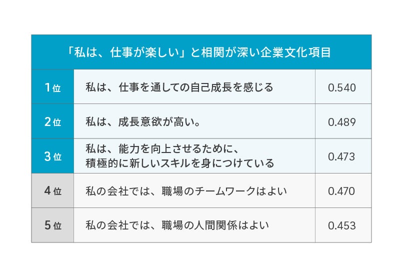・「仕事を通して自己成長を感じる」に肯定的な回答をした人は、仕事への満足度が高く、仕事を楽しむ傾向がある