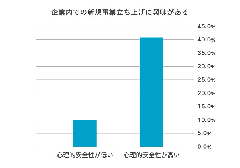 新規事業に関心がある人の数は、心理的安全性が高い職場の方が低い職場の4倍に