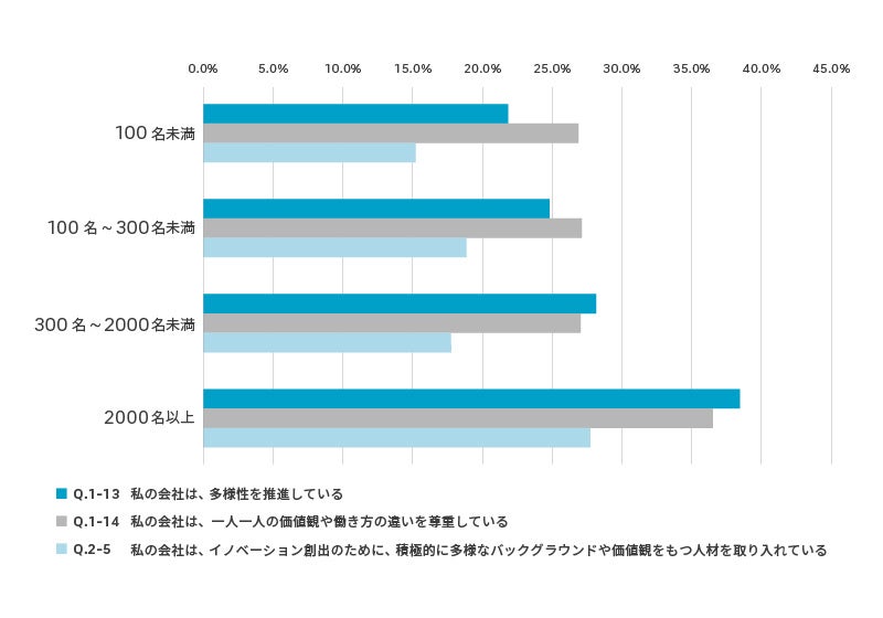 ・「職場が多様性を推進している」に肯定的な回答をした人は、企業規模が大きくなるほど増える