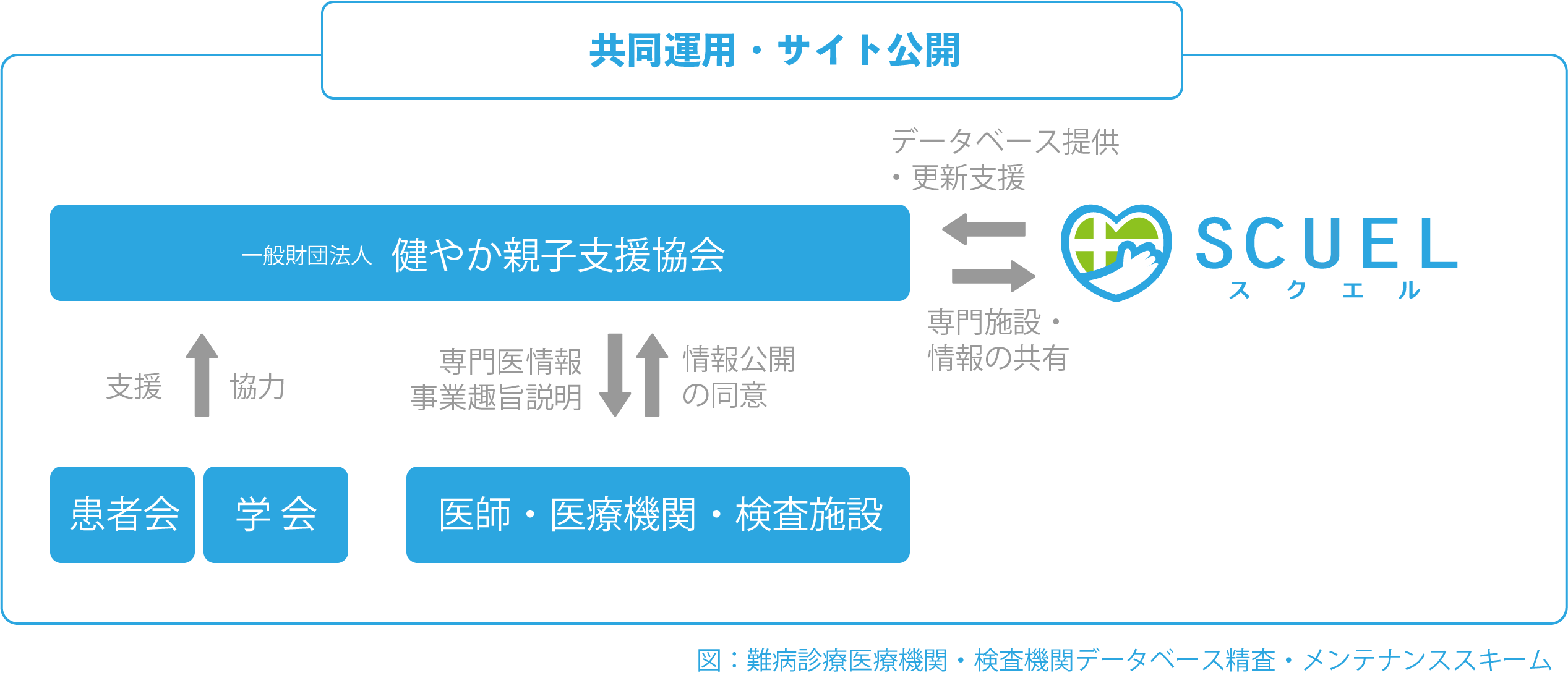 本サイトの構築と運営にあたっては、長らく小児希少難病の患児や家族に寄り添い、支援のインフラ整備に取り組む健やか協会が、難病分野の専門家と患者会を中心に「小児希少難病精査医療機関検索サイト検討委員会」を立ち上げ議論を進め、医療情報サイト運営会社であり、医療関係のデータ蓄積と管理運営のノウハウを有するミーカンパニーの独自データベース「SCUEL(スクエル)」に精査診療機関情報を登録し、運用してまいります。