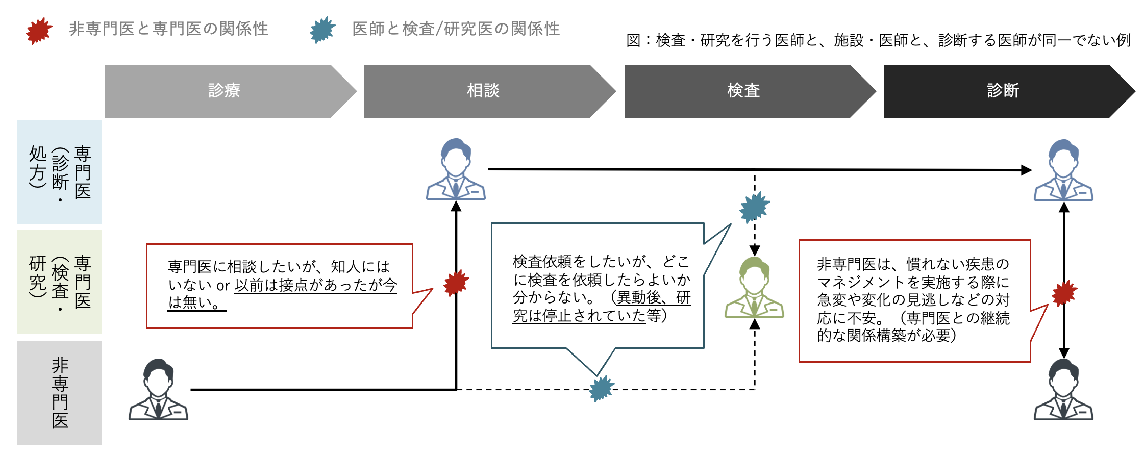 難病診療における非専門医は、希少疾患患者と接する機会が少なく検査実施や鑑別には専門医(診断または検査を行う医師)の協力が必要となりますが、そのような情報は現代の情報社会においても探しにくく、非専門医が専門医との接点を持っていたとしても、相談する際には異動していることがあったり、難病研究を停止されていたりすることもあり、紹介や相談先に困ることが起きています。