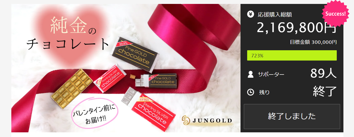 バレンタインデー企画プロジェクト「純金のチョコレート」は200万円超え達成