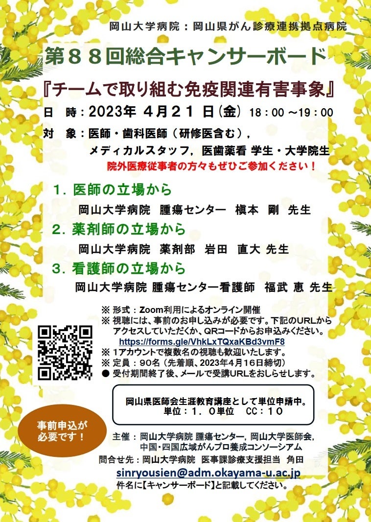 今回、第88回総合キャンサーボード「チームで取り組む免疫関連有害事象」を2023年4月21日(金)にオンラインで開催します。
