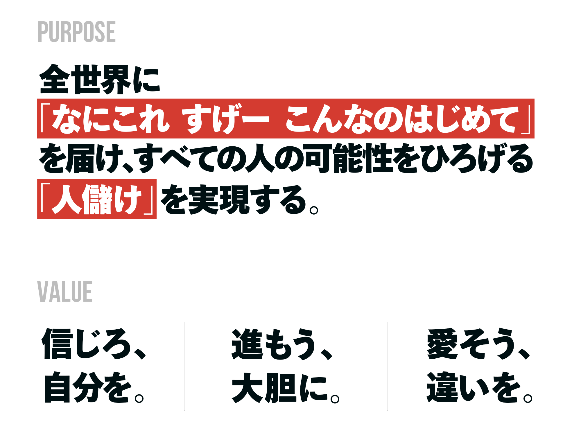 全世界に「なにこれ すげー こんなのはじめて」を届け、すべての人の可能性をひろげる「人儲け」を実現する。