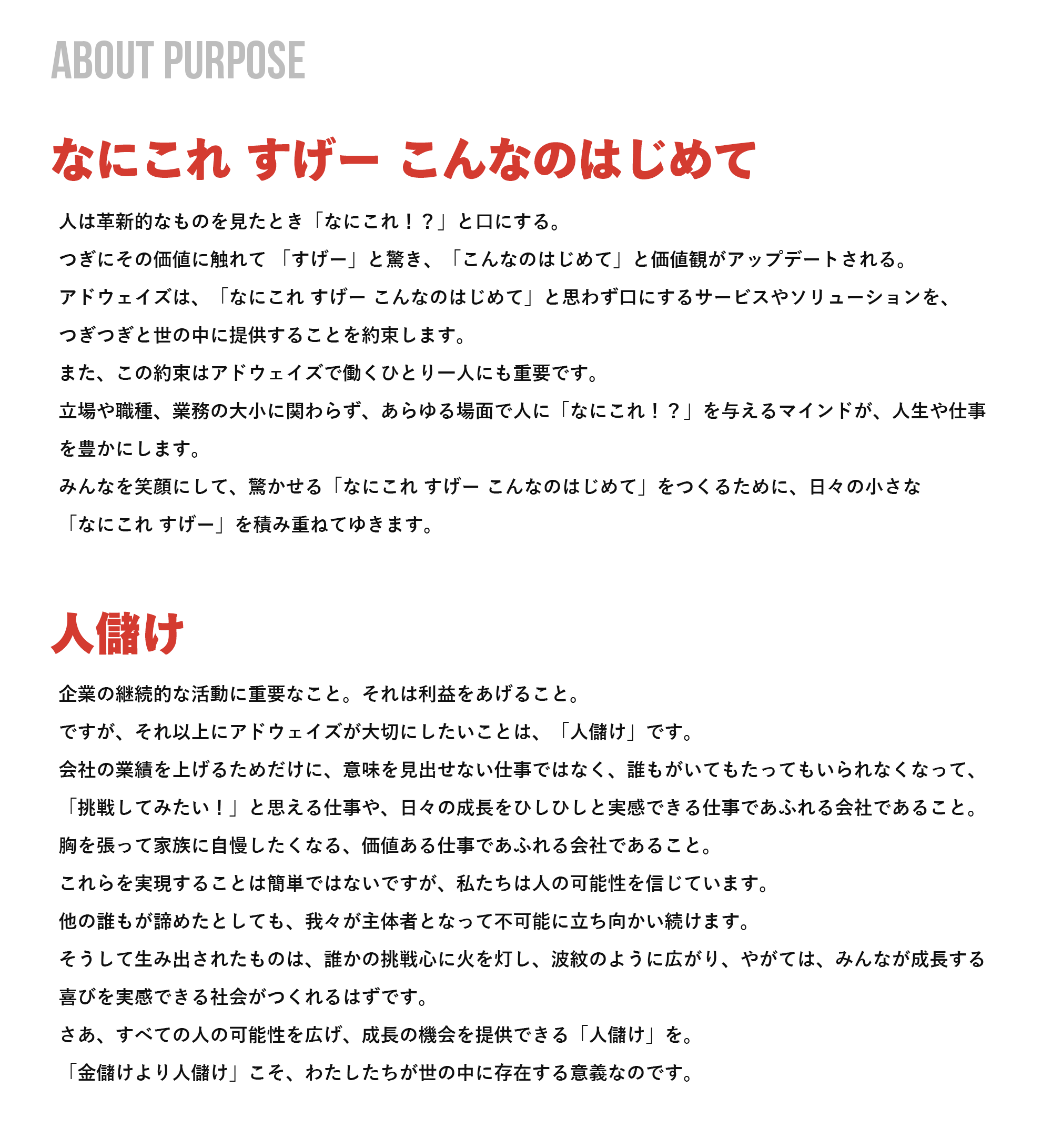 これまでなかった“なにこれ すげー こんなのはじめて”を、できるだけ多くの方々へ届け、すべての人が成長できる社会へ向け、アドウェイズは、事業を通じて本質的な価値を創造し、パーパスを実現してまいります。