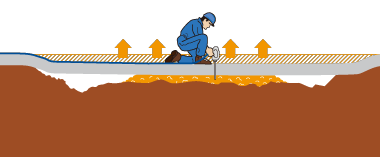 メインマーク株式会社の特許工法「テラテック工法」は硬質ウレタン「テラテック樹脂」をコンクリート土間床下に注入し、その膨張力で床下の空洞を埋め、沈んだ床を水平に戻す特許工法です。床を壊さず設備の移動をせず、【業務停止時間ゼロ】でコンクリート土間床の傾きや沈下を修正できる工法として、創業から4200件以上の施工を行ってきました。