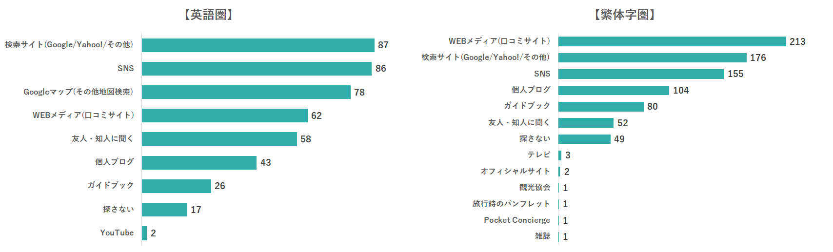 英語圏・繁体字圏のユーザーを対象に、株式会社D2C Xと当社が共同で行った「訪日旅行についてのアンケート調査」では、訪日外国人観光客が飲食店を探す方法として、Google検索以外にも様々な手段を用いていることが明らかとなりました。