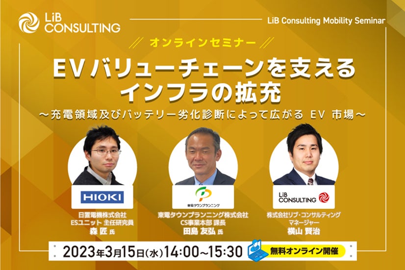 株式会社リブ・コンサルティング(本社:東京都千代田区、代表取締役:関 厳)は、「EVバリューチェーンを支えるインフラの拡充」をテーマとしたウェビナーを2023年3月15日(水)に開催いたします。