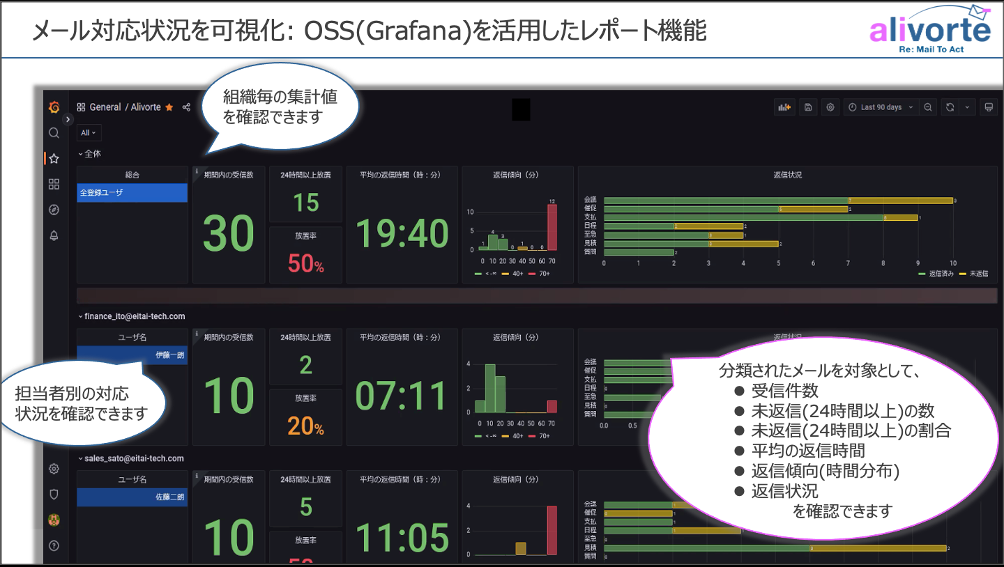 組織の管理者は、alivorteを利用する担当者のメール対応状況を可視化ツール(OSSを利用)を介して把握することができます。管理者は以下のような数値を把握することで、より強力な組織運営を実現することが可能となります。