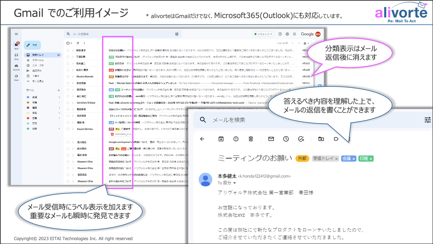AIによるラベル表示がされたメールへ返信をすると、ラベル表示は自動的に消えます。これは、ラベル表示が受信ボックスから消えることで、alivorte利用者が対応済みのメールと未対応のメールを区別しやすくするためです。『メールへ返信をするとラベル表示が消える』を繰り返し経験することによって、メールを放置せず、いち早く返信することを習慣化することができます。