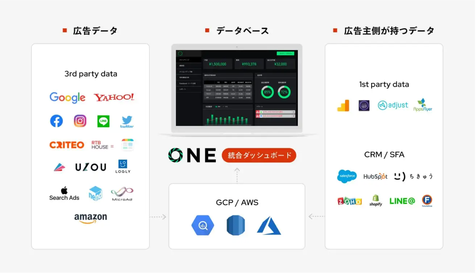 ONEとは、様々な広告媒体の運用データとアクセス解析データ、SFA/CRMデータを統合することで、LTVや最終CVなどに最適化をさせた広告運用を実現する広告BIプラットフォームです。