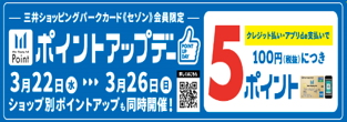 さらに、3月22日(水)〜26日(日)期間中に、三井ショッピングパークカード(セゾン)会員様限定でポイントアップキャンペーンを実施いたします。新生活に向けてららぽーと名古屋みなとアクルスでお得にお買物をしていただけます。
