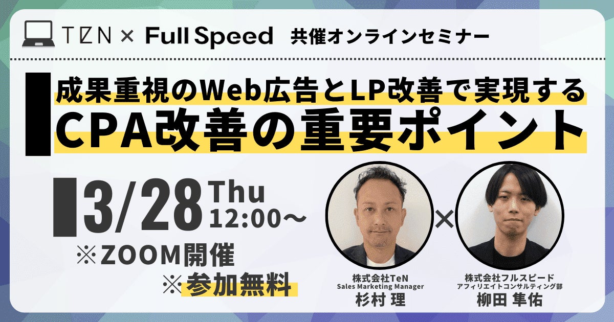 そこでこのたび、EC / D2Cビジネスをはじめ多くの企業様のアフィリエイト広告運用支援実績を持つ当社と、総勢100社に導入実績のあるLPO(ランディングページ最適化)サービス「LandingHub」を提供する株式会社TeNの2社で、「成果重視のWeb広告とLP改善で実現する CPA改善の重要ポイント」と題したオンラインセミナーを開催します。アフィリエイト広告による集客とLP改善の両視点でCPAの改善方法について紹介いたします。