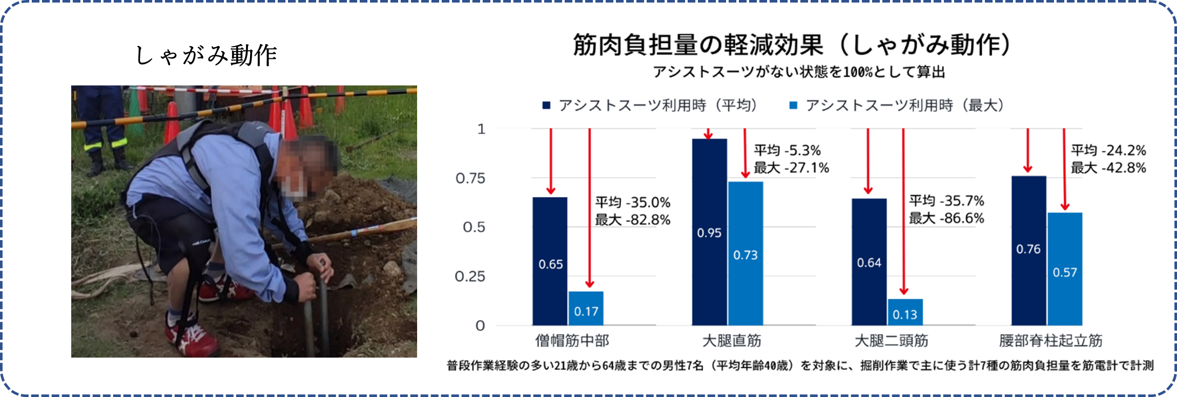 本製品の着用により、対象の筋肉における筋肉負担量が未着用時と比較して最大3~8割軽減する効果が見られました。