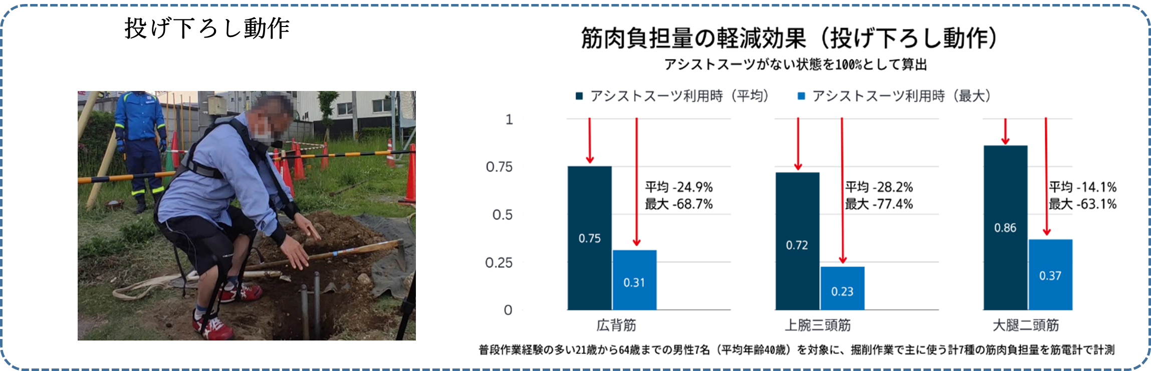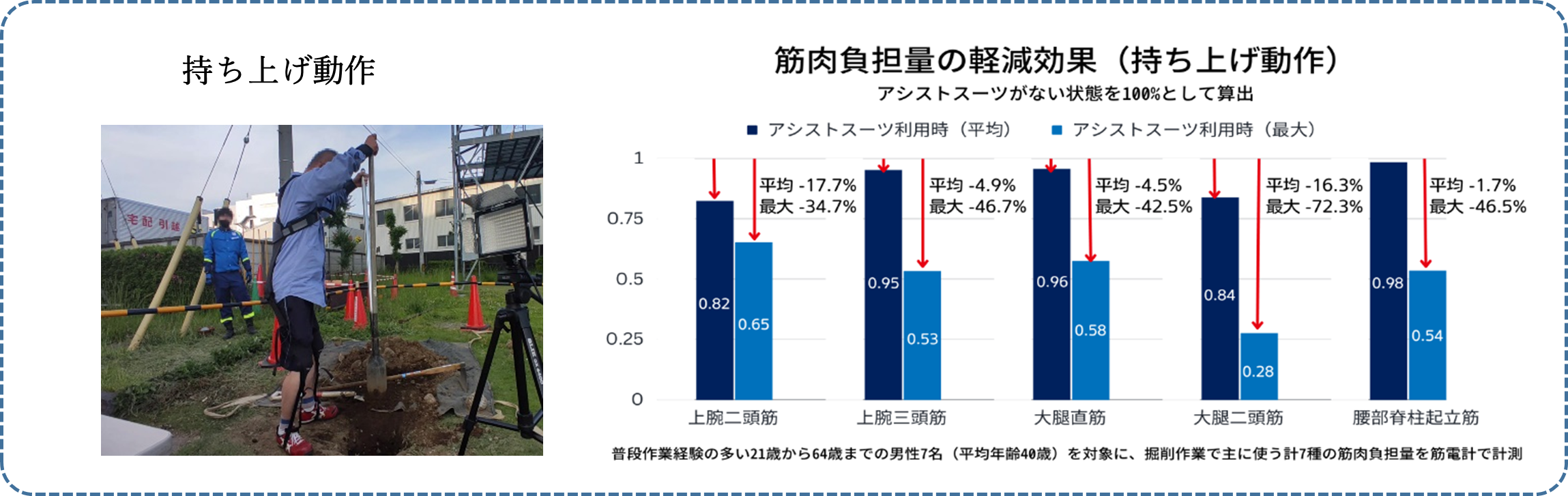 掘削作業で行う主な3つの動作における筋肉負担量を筋電計で計測しました。