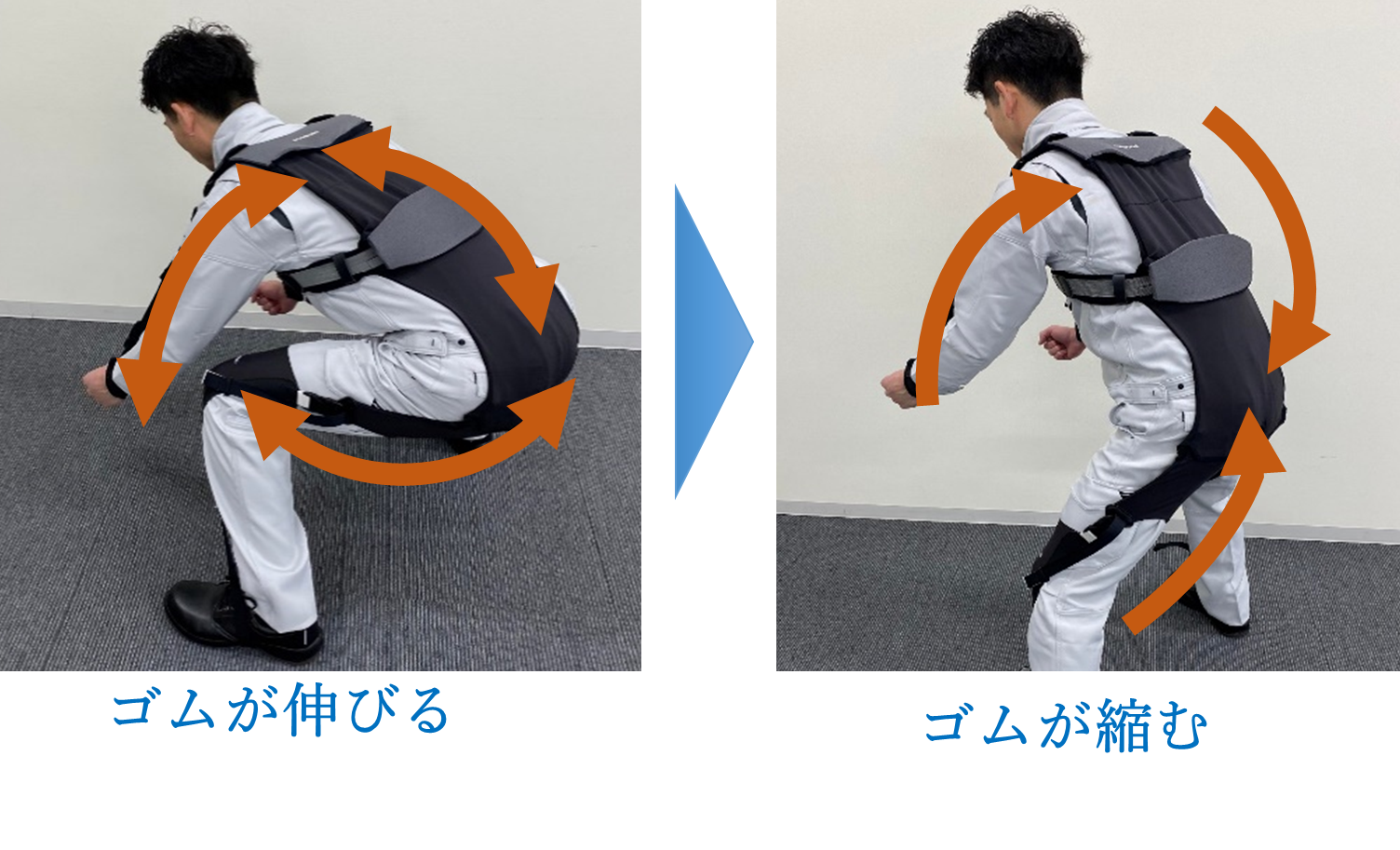 作業者が腰を落とした中腰姿勢をとり、土砂をすくおうとすると人工筋肉とゴム部分が伸長し、土砂をすくい上げる際に伸長した部分が収縮することでアシスト力を発揮し、作業負担を軽減します。また、本製品を着用することで不良姿勢を取りづらくなるため、中腰姿勢の荷物の持ち上げや持ち運び等の運搬作業にも負担を軽減します。