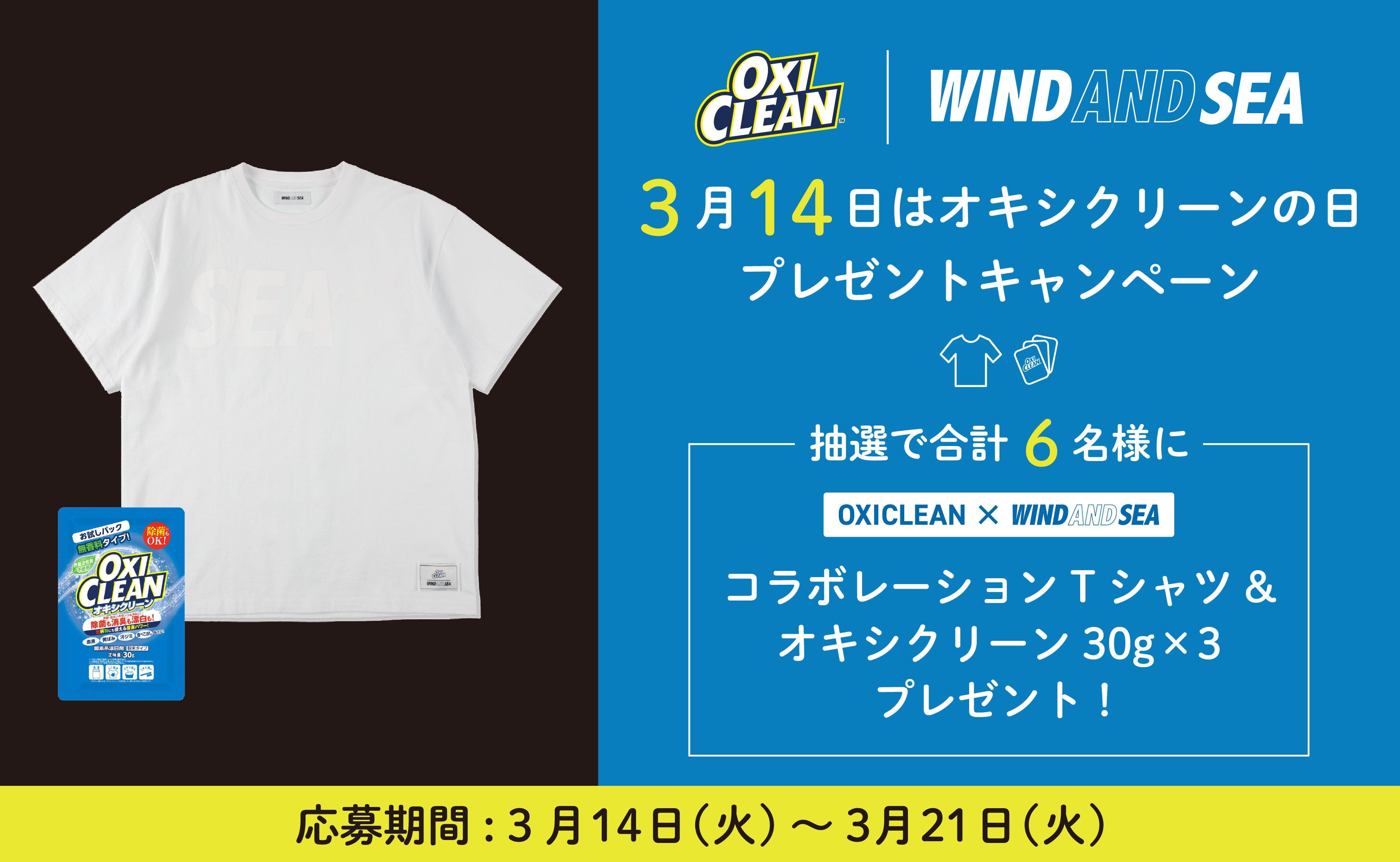 ■景品:オキシクリーン×WIND AND SEA コラボ白Tシャツ(Mサイズ 3名/Lサイズ 3名)