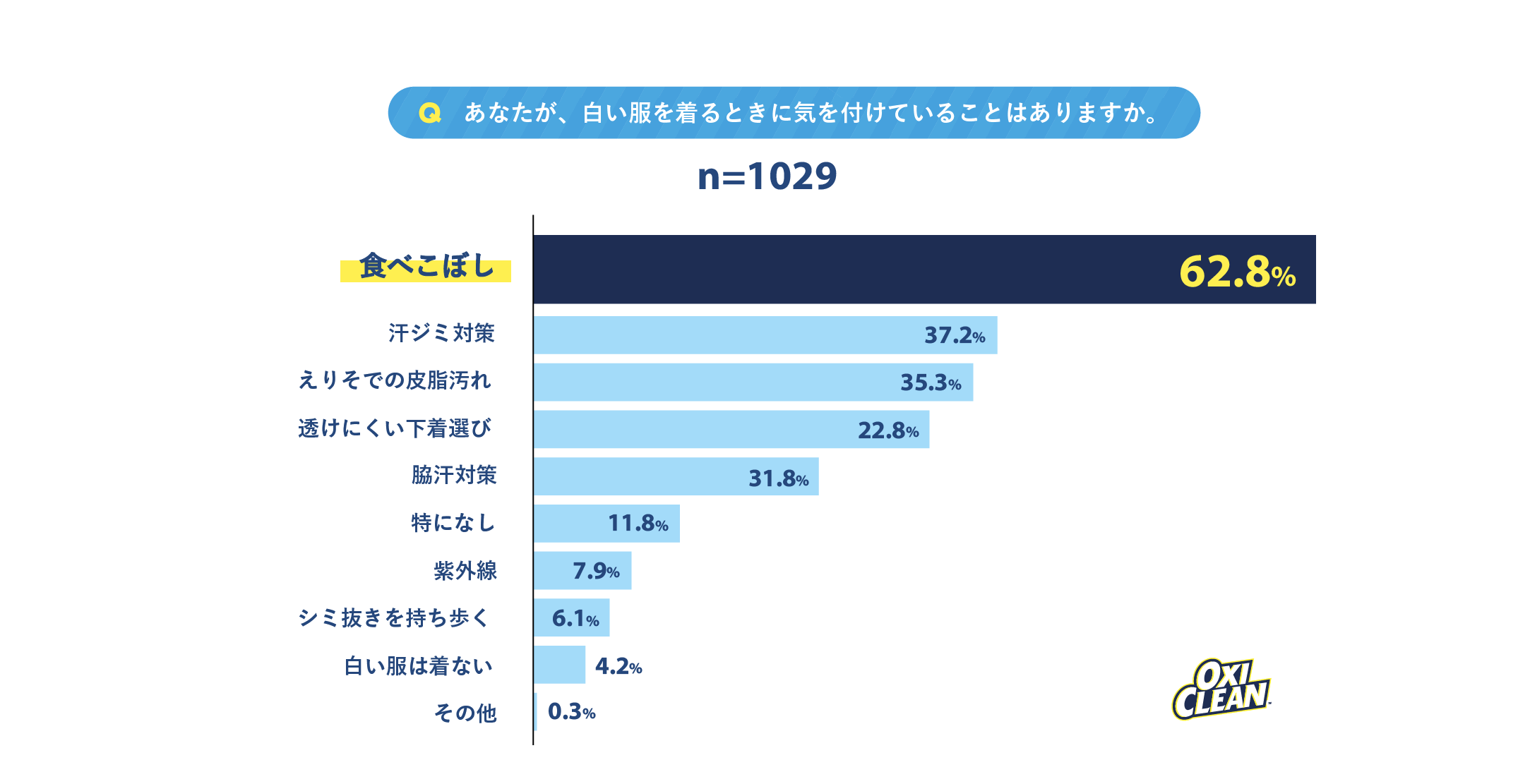 白い服を着るときに気を付けていることをたずねたところ、62.8%の人が「食べこぼし」と回答しました。次いで、「汗染み対策(37.2%)」「えりそでの皮脂汚れ(35.3%)」と続き、白い服だからこそ目立ってしまう日々の汚れが上位にランクインしました。あたたかくなるこれからの季節、皮脂汚れや汗染みは冬以上に気になる方が増えると考えられます。