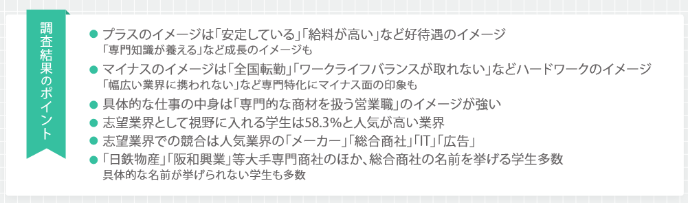 調査結果では、「安定している」「給与が高い」などの好待遇のイメージが強い一方で「全国転勤」などのハードワークのイメージも強いことがわかりました。また、知っている社名を聞いた設問では総合商社の名前を挙げる学生が多く、専門商社を具体的なイメージできていない様子がわかりました。