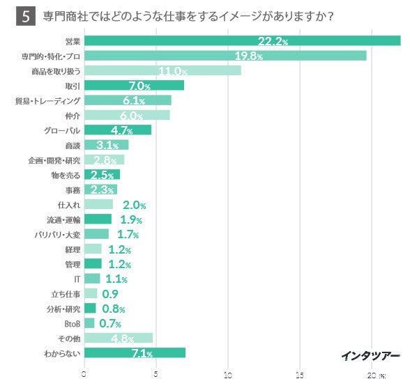キーワードを集計)最も回答が多かったキーワードは「営業」22.2%で、「専門的・特化・プロ」19.8%が続きました。専門的な分野の商品知識が求められる営業職、というイメージが強いようです。また、「取引」7.0%、「貿易・トレーディング」6.1%、「仲介」6.0%といった商材仕入れのイメージも強いようです。