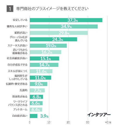 最も回答が多かった選択肢は「安定している」37.3%で、「優秀な人材が多い」34.9%、「給料が高い」29.8%が続きました。収入面を含め安定した働き方ができるイメージが強いようです。また、「グローバル化が進んでいる」24.3%、「ステータスが高い」19.0%といった回答からも、世界的な活躍ができ社会的なステータスも高い仕事のイメージがあるようです。一方で、学生が企業を選ぶ軸として重視されるようになってきた「社会貢献度が高い」15.1%、「自分が成長できる」14.7%、「ワークライフバランスがとれる」6.6%といった選択肢は比較的回答が少なく、ESGや働き方改革といった軸ではあまりプラスイメージを持っていないようです。