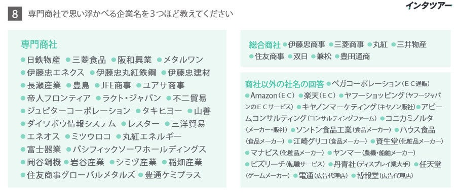 設問8では、専門商社の具体的な企業の名前を3社挙げてもらいました。