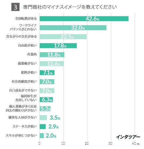 最も回答が多かった選択肢は「全国転勤がある」42.6%で、転勤に対するマイナスイメージが強くみられました。次いで「ワークライフバランスが取れない」32.0%、「昔ながらの文化がある」22.5%、「自由度が低い」17.8%が上位となりました。これらのイメージから、ハードワークで上意下達の職場がイメージされていることがうかがえます。
