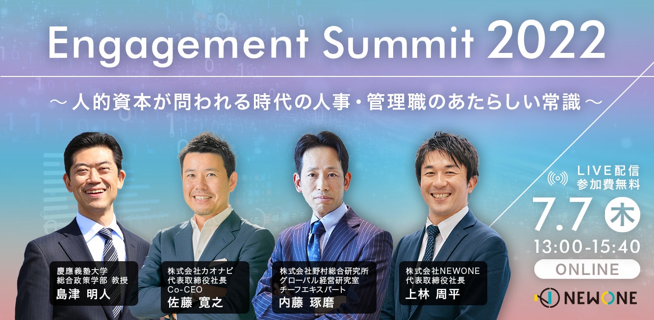 今年3回目となる「エンゲージメント・サミット2022」では、いま企業では何が起こっているのか、人的資本経営元年といわれる今年、ビジネスモデルと人材戦略のかけ合わせとはどういうことか、今後カギとなっていくミドルマネ―ジャーの活かし方などを、第一部は慶應義塾大学 総合政策学部 島津 明人教授より講演、第二部では、業界最前線の目線から(株)カオナビCo-CEO佐藤 寛之氏、(株)野村総合研究所チーフエキスパート内藤琢磨氏をお迎えし、NEWONE代表の上林と3名のパネルディスカッションを実施いたします。