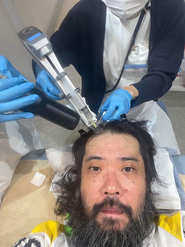 高山が行った治療は、2週間ごとの「発毛カクテル注射」と「医療ヘッドスパ」、1日1回2錠の「マイティアップ内服薬」の服用です(※)。なお、高山の生活の一部と化している、飲酒、喫煙、暴食は控えることができないと医師に相談のうえ、治療を開始いたしました。