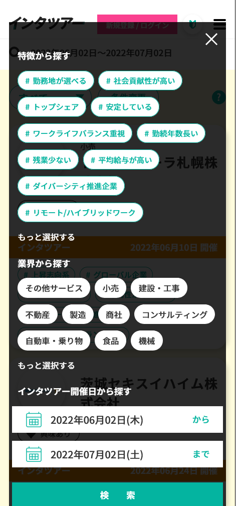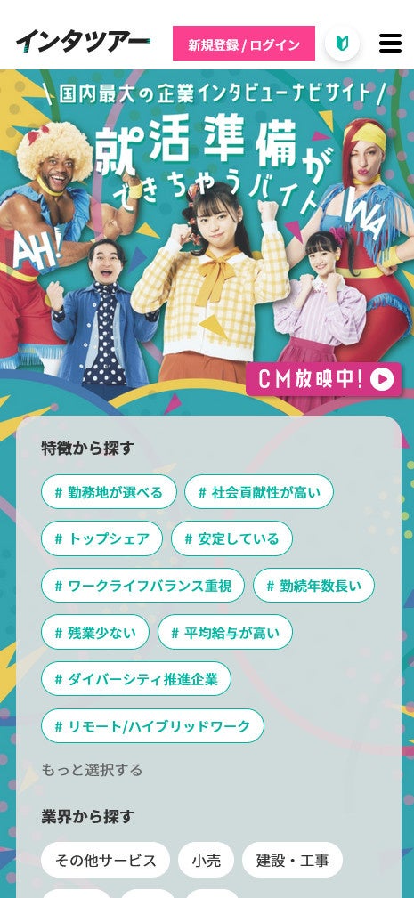インタビュー開催日程に加え、特徴や業界など就活の軸となる項目から検索できるように機能を強化。ビジコミ(レビュー)も探しやすくなっています。