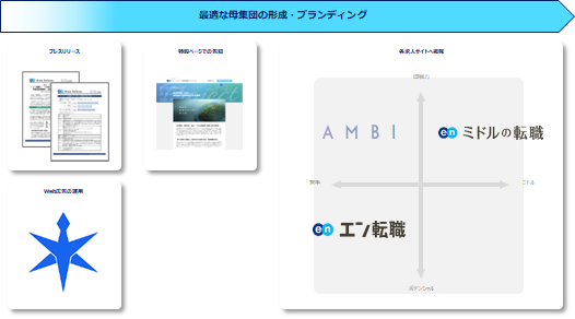 プレスリリースや特設ページ、Web広告での告知に加え、各求人サイトでの集客支援を実施。『エン転職』『AMBI』『ミドルの転職』とターゲットの異なる3つの求人サイトを活用することで、ターゲットへ網羅的に求人を届けました。