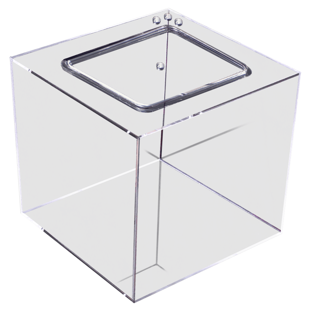 アクリル蓋付き、フランジは美しく割れにくい一枚もの、自動給餌器対応の50mm給餌穴、アクリルは国産キャスト板。